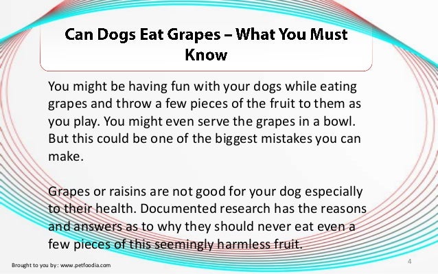 By petful veterinary team sep 24 .. Some dogs may suffer more severe reactions than others. Can dogs eat grapes. The exact cause of toxicity in dogs after they ingest a grape is not known nor is the amount.